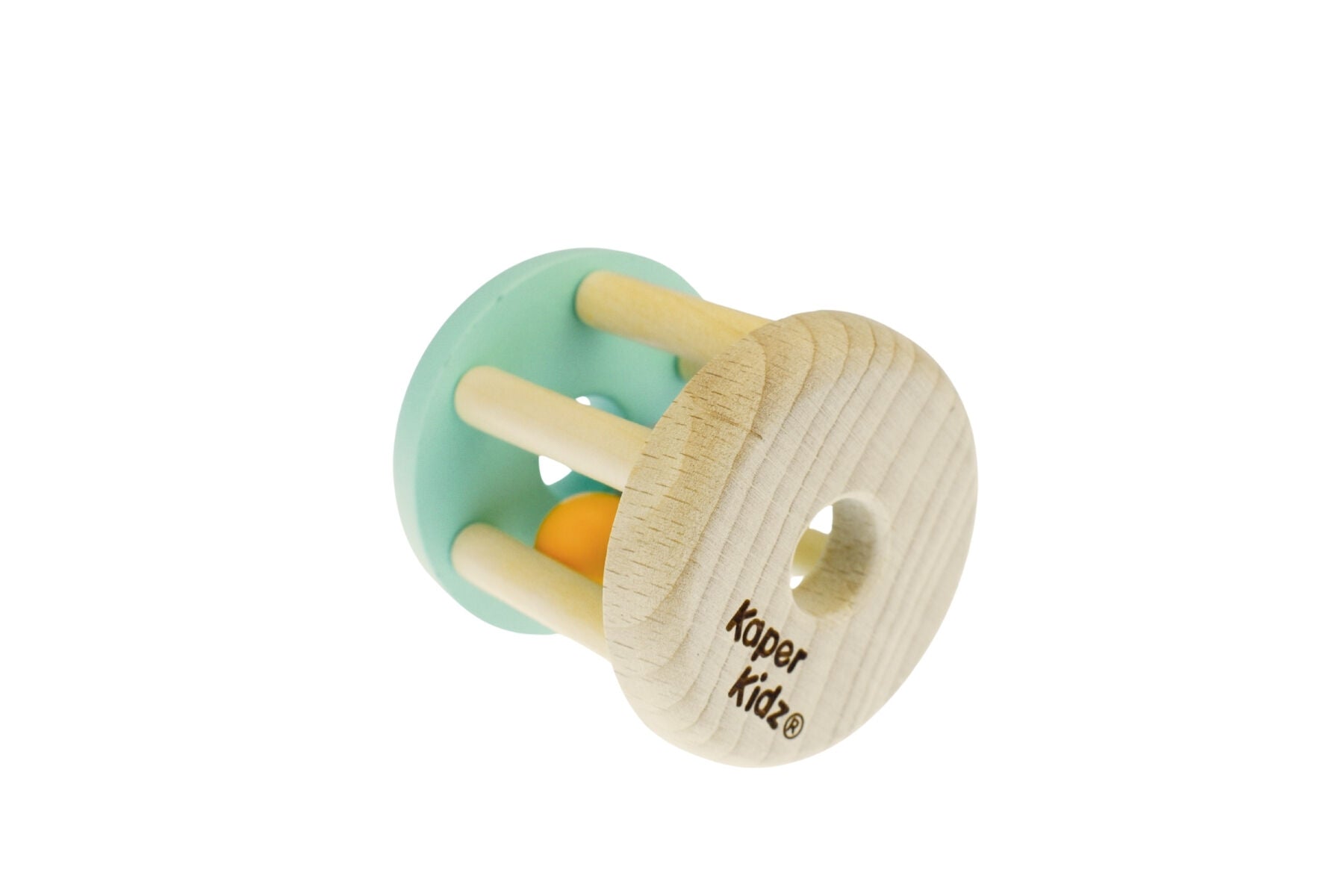 The Mint Calm & Breezy Wooden Rattle from Kaper Kidz is a sweet and soothing first toy for little ones. Crafted from smooth, sustainable timber and finished in a refreshing mint tone with child-safe, non-toxic paint, it???s designed to be both safe and stylish. Featuring rounded edges and easy-to-grip bars, this rattle contains colourful wooden beads that gently clatter as they roll and shake. Ideal for encouraging sensory exploration, it helps develop grasping skills, hand-eye coordination, and early sound awareness. A fresh and calming colour choice, the mint rattle makes a lovely gift or nursery addition.