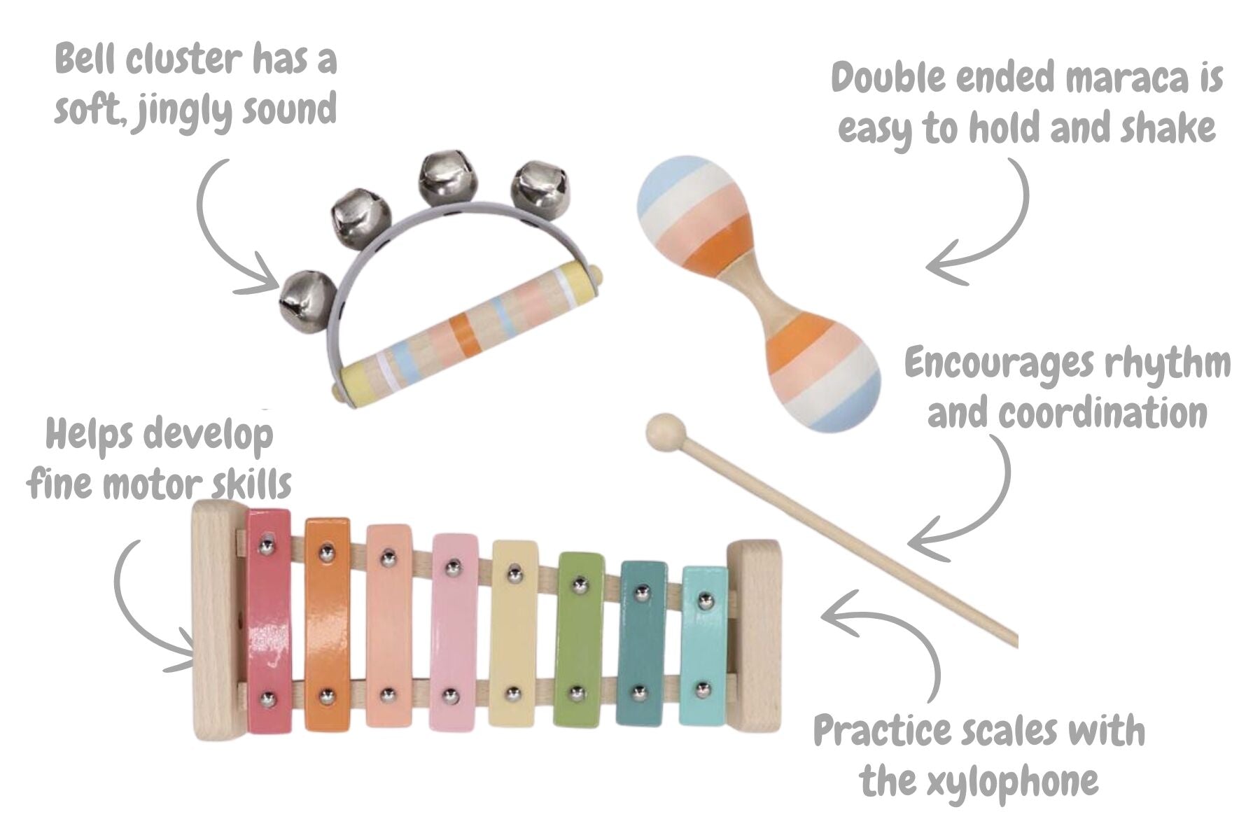 This set includes a wooden xylophone with metal keys in a sweet gradient of colours, a handbell shaker bursting with jingles, and a stripy maraca that sings with every shake. Made from smooth wood and lovingly painted with non-toxic, child-safe paints, these sets are a perfect introduction to the magical world of music.
