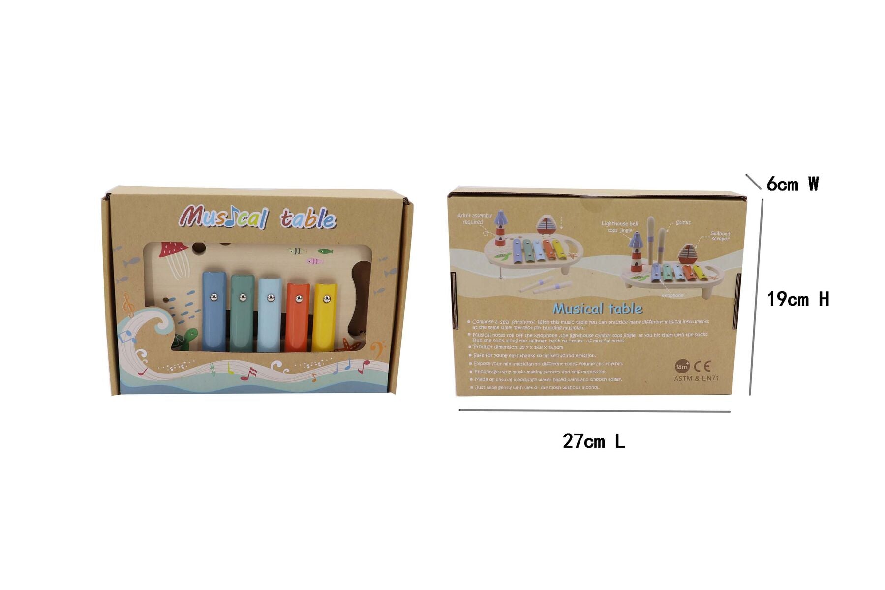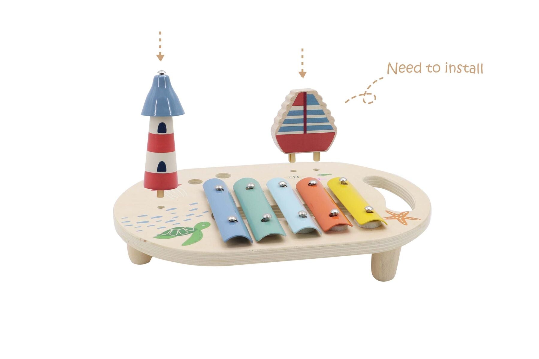 Set sail on a musical adventure with the Wooden Ocean Music Table from Kaper Kidz???a charming ocean-themed set packed with rhythm and fun! Featuring a lighthouse with a shiny cymbal roof, a sailboat scraper, a colorful knock xylophone, and two wooden drumsticks, this delightful table is decorated with cheerful sea creatures and playful underwater scenes that inspire creativity and joy.